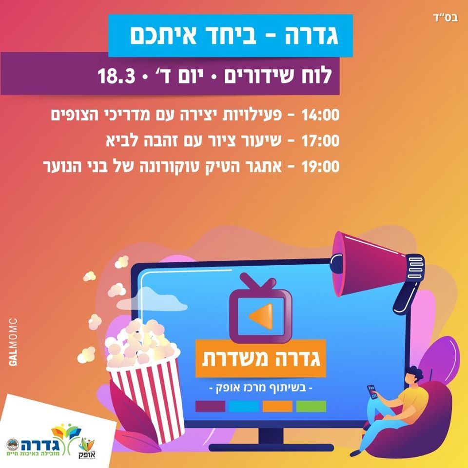 הכירו את פופקורונה TV! לוח שידורים מיוחד של המועצה המקומית גדרה ומרכז אופק עם פעילויות לכל המשפחה. בימים הקרובים יעלה בדף הפייסבוק לוח השידורים בו יוצעו לתושבים שיעורי ציור, משחק, יצירה, התעמלות ועוד.