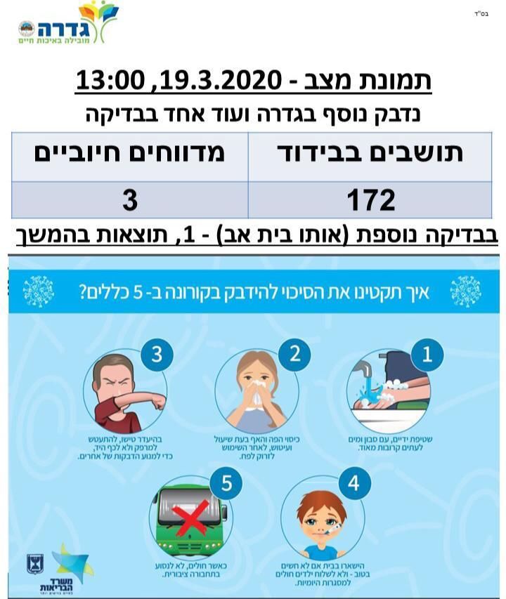 תושב גדרה נוסף אובחן כחולה קורונה; נכון להיום (חמישי 19.3) מספר חולי הקורונה עומד על 3 ביישוב כאשר תושב נוסף נמצא בבדיקה