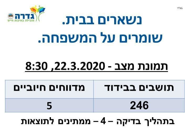 נכון ליום ראשון 22.3 יש 5 חולי קורונה בגדרה ו253 נמצאים בבידוד