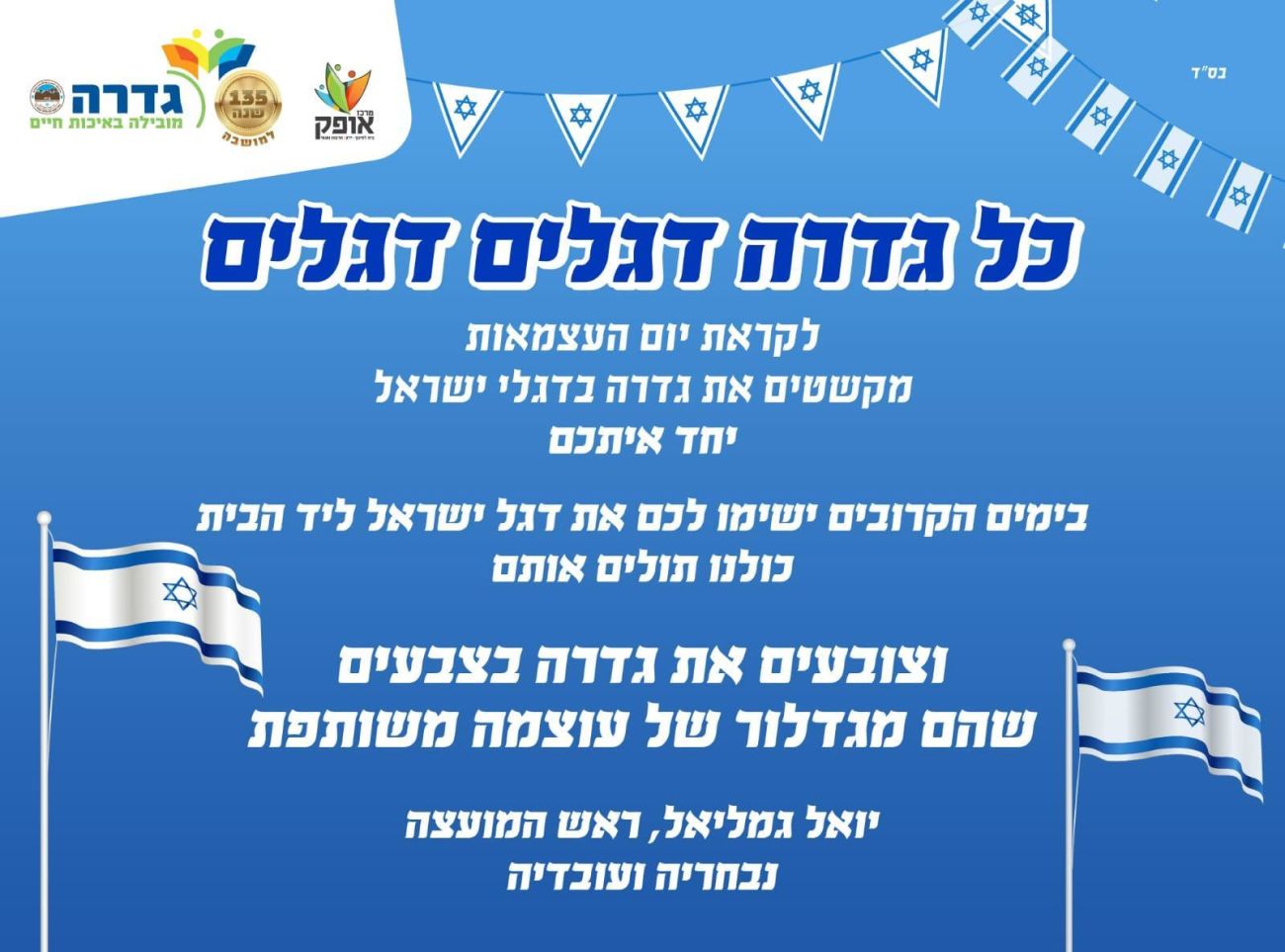 בגדרה לא מוותרים על אוירת החג ולרגל יום העצמאות הקרב, יצאה המועצה בפרוייקט חלוקת דגלי ישראל לתושבים. בימים הקרובים יעברו צוותי המועצה ומרכז אופק בית, בית ויחלקו לתושבים את הדגלים אותם הם מתבקשים לתלות בבתיהם. המטרה של הפרוייקט ליצור אוירת אחדות ושותפות וכן ליצור את אלבום הדגלים הגדול של גדרה