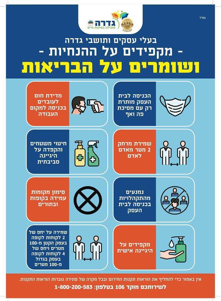 לאור ההנחיות החדשות של משרד הבריאות ופתיחת העסקים בישראל, בימים אלו החלה המועצה המקומית גדרה בחלוקת שילוט מפורט המסביר את ההנחיות הנדרשות מבתי העסק והלקוחות. במועצה מבקשים מבעלי העסקים והתושבים להקפיד על ההנחיות על מנת לשמור על בריאות הציבור.