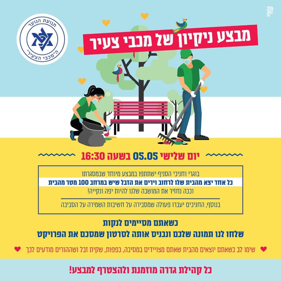 ביום שלישי 5.5 תנועת מכבי צעיר גדרה מזמינה את התושבים להצטרף למבצע הניקיון של סביבת מגוריהם