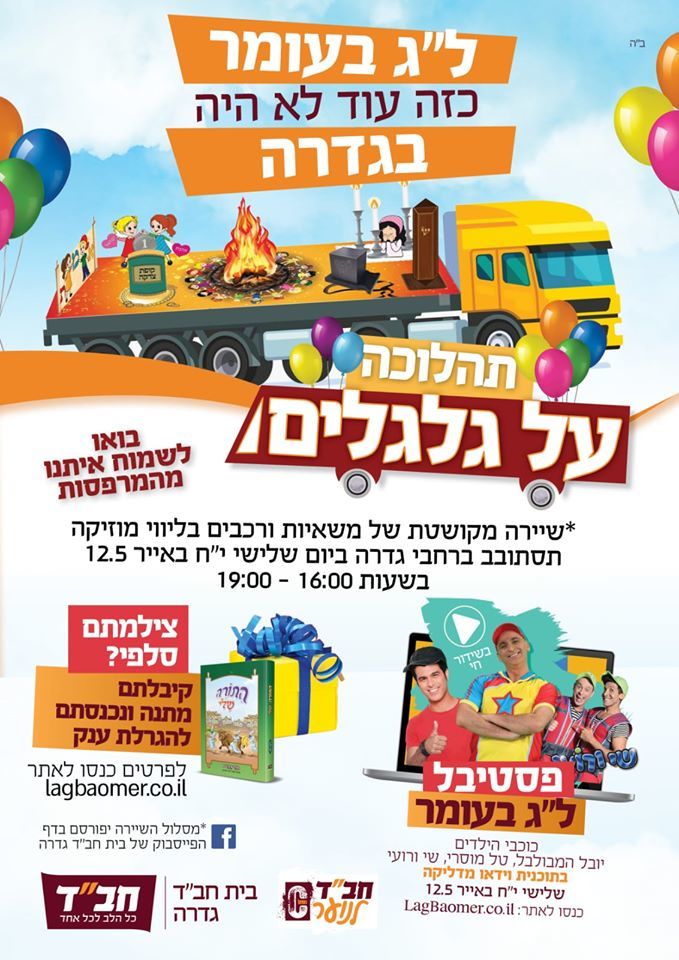 חגיגת ל"ג בעומר בגדרה! ביום שלישי 12.5 תתקיים תהלוכת ל"ג בעומר המסורתית של בית חב"ד עם משאית מוזיקה ושירים שתסתובב ברחבי גדרה