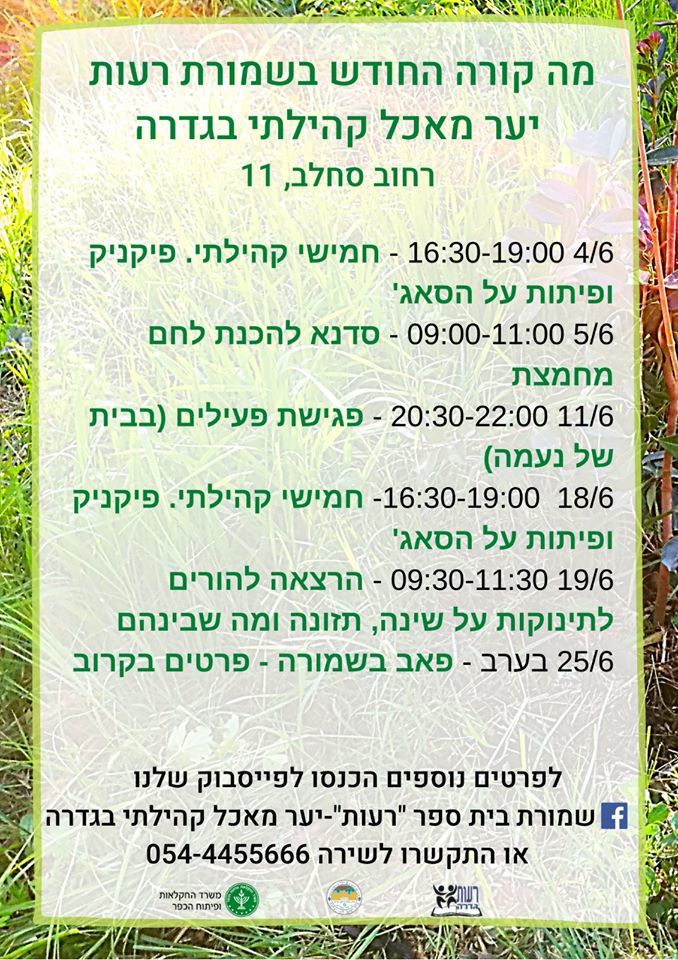 חוזרים לשגרה בגדרה! ביום חמישי 4.6 שמורת רעות - היער הקהילתי בגדרה חוזרת לפעילות עם פיקניק קהילתי לתושבים; תוכנית האירועים המלאה לחודש יוני מצ"ב בכתבה