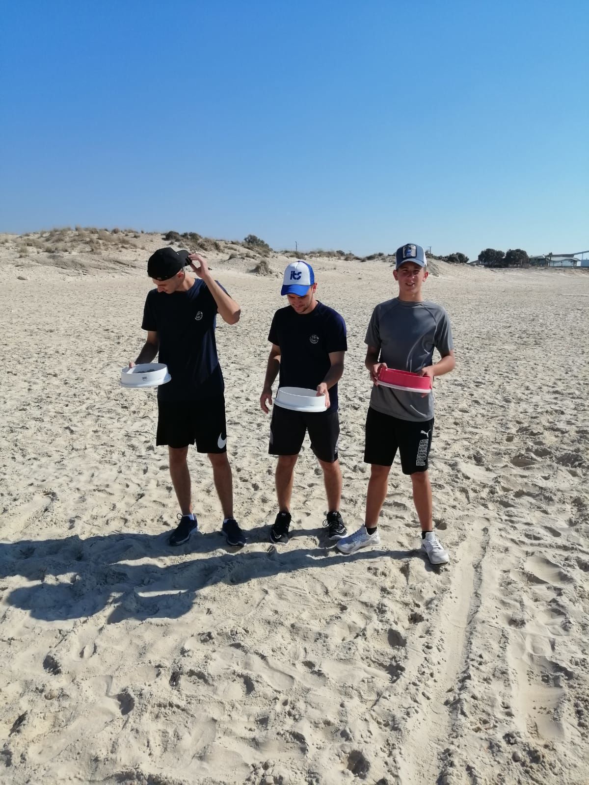 בתמונה התלמידים נמצאים בחוף שדות ים בעיצומו של תהליך סינון החול למדידת כמות המיקרופלסטיק