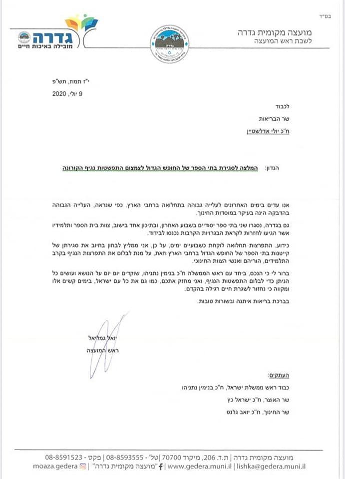 ראש המועצה, יואל גמליאל פנה אל שר הבריאות, יולי אדלשטיין על מנת לסגור את פעילות קייטנות הקיץ של החופש הגדול ברחבי הארץ. הפנייה באה בעקבות העלייה בתחלואת הקורונה וסגירת 2 בתי הספר קשת ורמון השבוע בגדרה.
