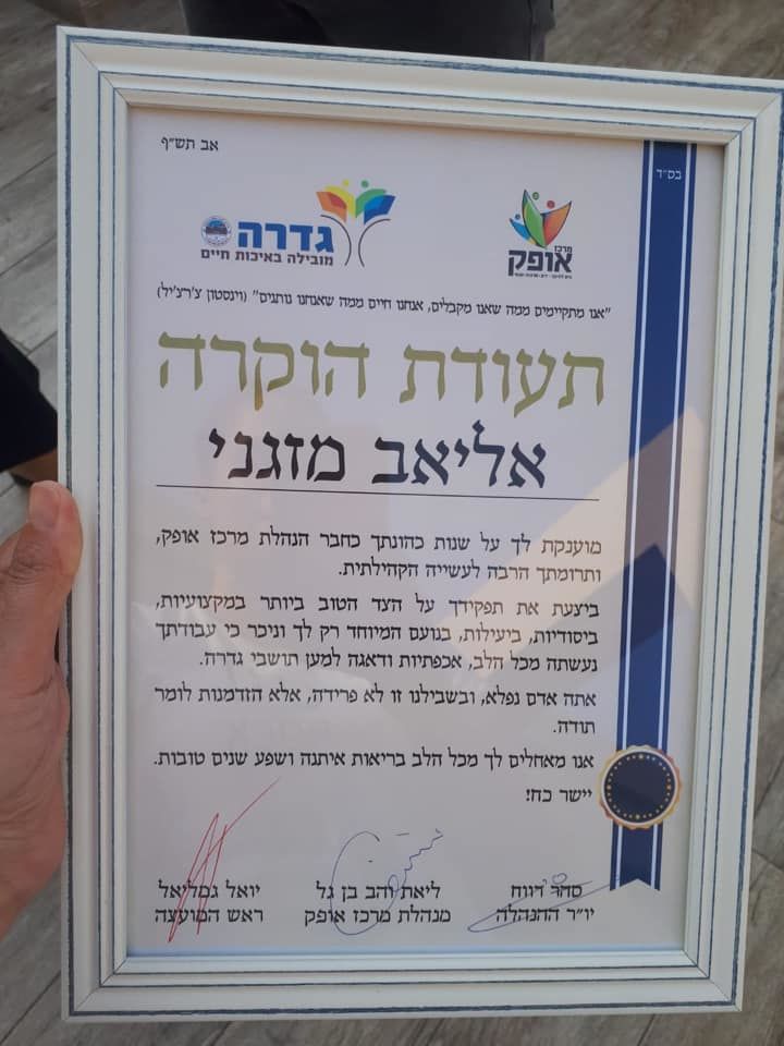 חילקנו תעודות הוקרה לכל אחת ואחד מכם, על שנות הכהונה כחברי הנהלת מרכז אופק ותרומתכם הרבה לעשייה הקהילתית. ביצעתם את תפקידכם על הצד הטוב ביותר, במקצועיות, ביסודיות, ביעילות ובנועם. ניכר כי עבודתכם נעשתה מכל הלב, תוך אכפתיות ודאגה, למען תושבי גדרה. ישר כח!