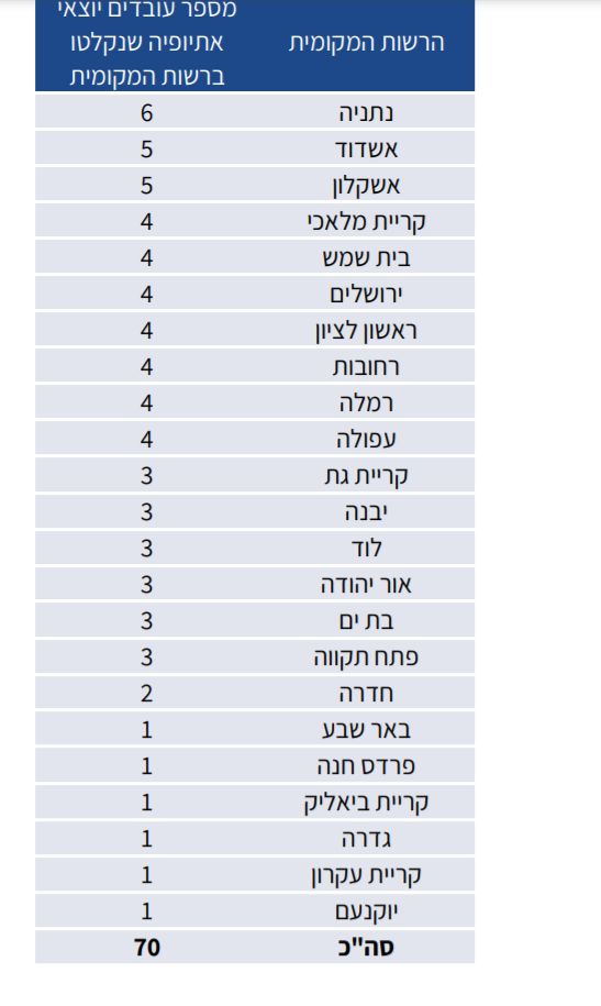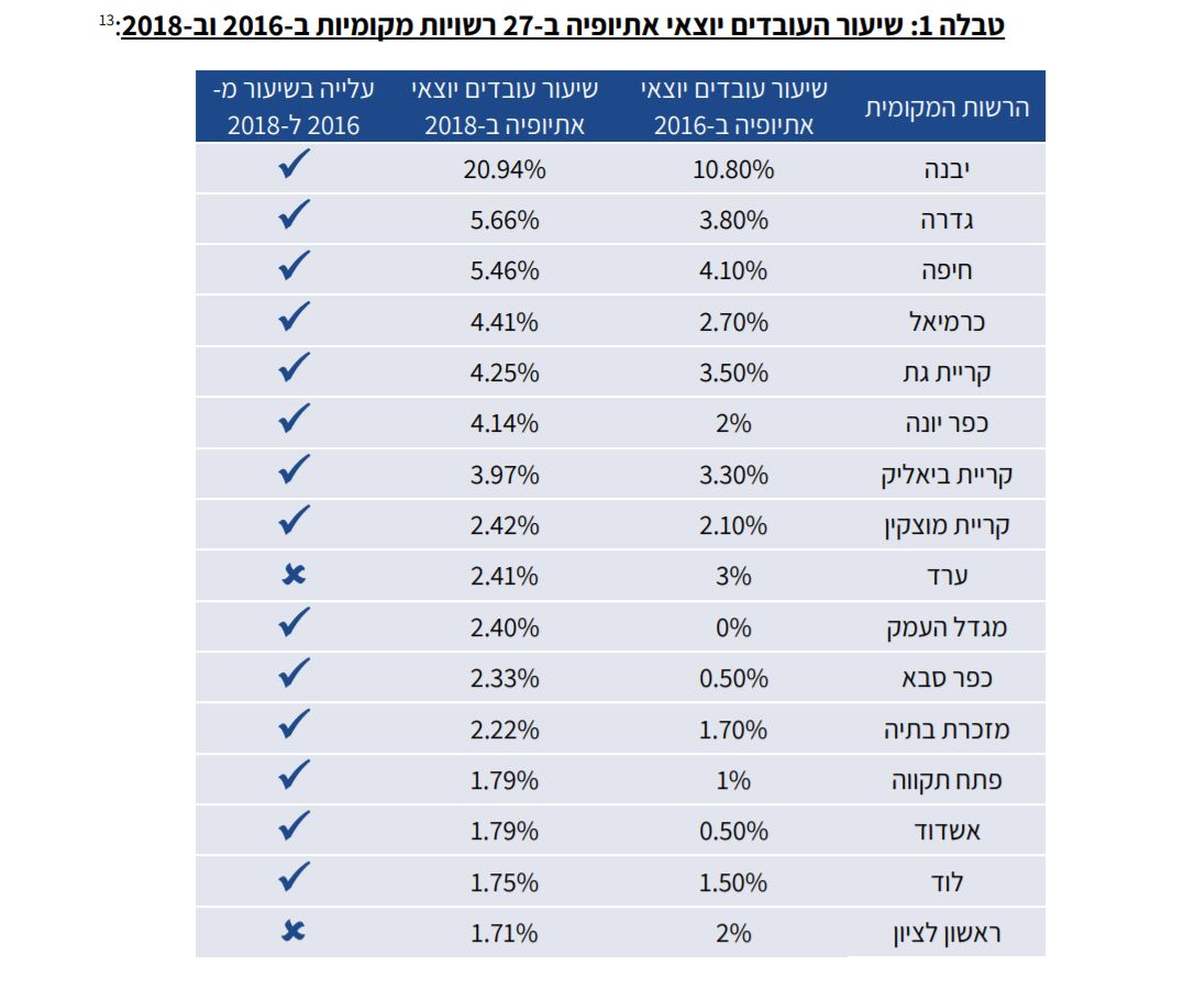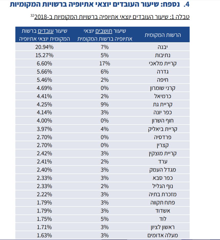 על פי הדוח ב119 הרשויות המקומיות שדיווחו היו 42,558 עובדים ומתוכם 670 עובדים יוצאי אתיופיה (1.57%)– כלומר הם לא עומדים ביעד הייצוג: