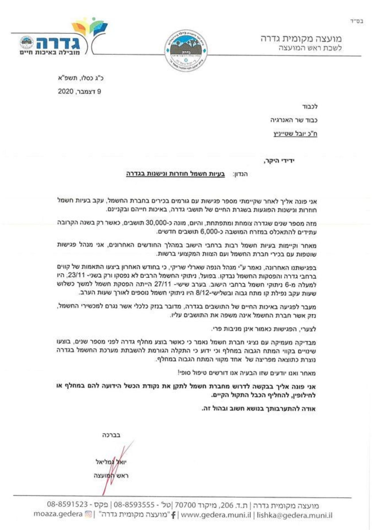 יש לציין כי לפני כשבוע הודיע ראש המועצה יואל גמליאל כי שלח מכתב דחוף לשר האנרגיה, יובל שטייניץ על מנת למצוא פתרון למצב. על פי מכתבו של גמליאל למרות פניות רבות לחברת החשמל והבדיקות שנעשו הפסקות החשמל לא מפסיקות והביאו לנזקים רבים לתושבים שמכשירי החשמל בביתם נהרסו מהמצב.