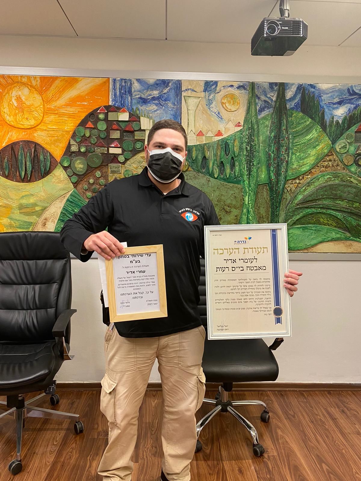 יואל גמליאל, העניק תעודת הוקרה למאבטח ביה"ס רעות בגדרה, עומרי אדיר, על תרומתו ופעילותו לשמירה על ביטחון ילדי ביה"ס