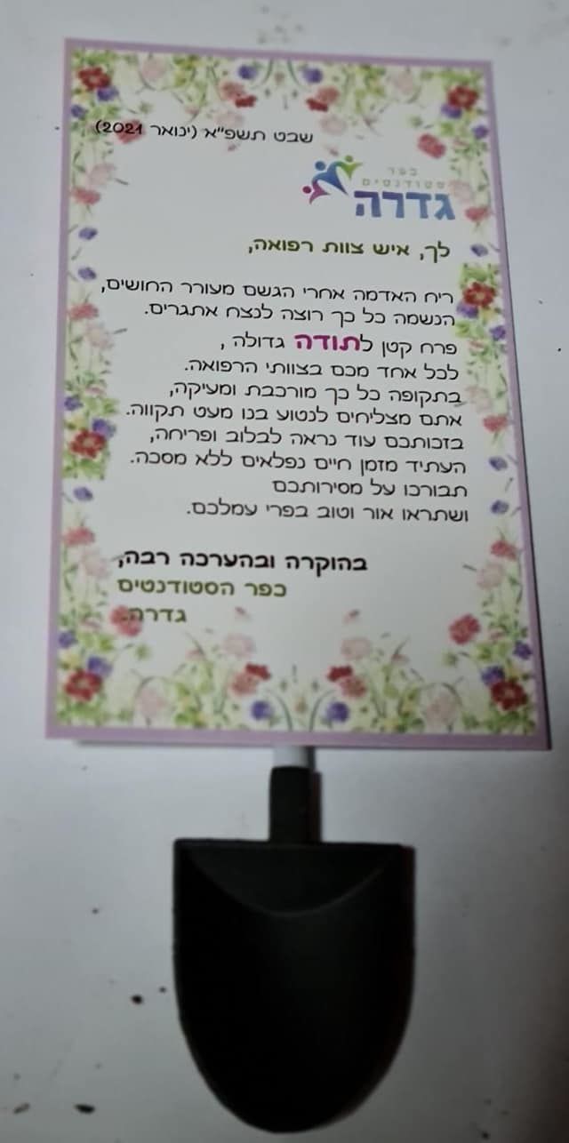 לרגל ט"ו בשבט, יצאו חברי כפר הסטודנטים בגדרה לפעילות התנדבותית למען הצוותים הרפואיים. לכבוד החג הם יצאו לעבר קופות החולים ומערך הרווחה העירוני וחלקו שתילים לעובדים כאות תודה על עבודתם ומלחמתם בקורונה.