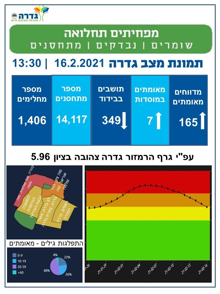 נכון להיום (שלישי 16.2) השכונות האדומות בגדרה הן קטרה, נווה שולמית ונווה משה. שימו לב למרות שגדרה הפכה לצהובה הציון הקובע את ההגבלות על הציון הוא בימי ראשון ורביעי - על פי החלטת הממשלה הציונים נקבעים פעמים בשבוע בימי ראשון ורביעי.