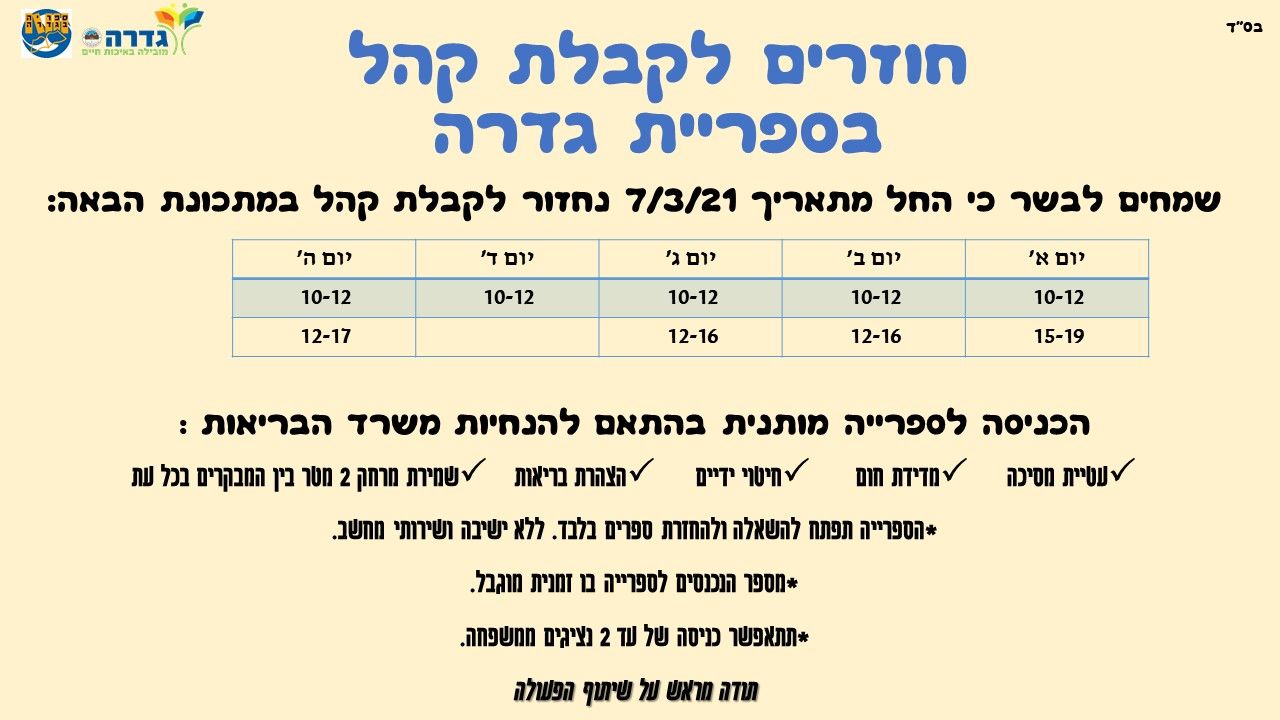 החל מיום ראשון 7.3 ספריית גדרה חוזרת לפעילות של השאלה והחזרת ספרים בלבד