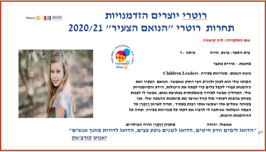 ליה קושניר זכתה בתחרות הנואם הצעיר הארצית של רוטרי ישראל. התחרות המתקיימת מדי שנה ברחבי הארץ במטרה להנחיל לתלמידי בתי הספר תרבות דיבור, תוך הקשב, סבלנות ויכולת להכיל דעה שונה, על ידי נאומי התלמידים בפני הקהל. בגדרה פועל הפרוייקט כבר 10 שנים בכל בתי הספר בישוב, בשיתוף פעולה של יואל גמליאל ראש המועצה וענת קוך מנהלת אגף החינוך. למרות תקופת הקורונה המאתגרת התחרות התקיימה גם השנה, כאשר חברי המועדון הדריכו את התלמידים בזום, ובנוסף קיימו השנה-נאומים באנגלית בהדרכתה של רבקה ניסים חברת המועדון.