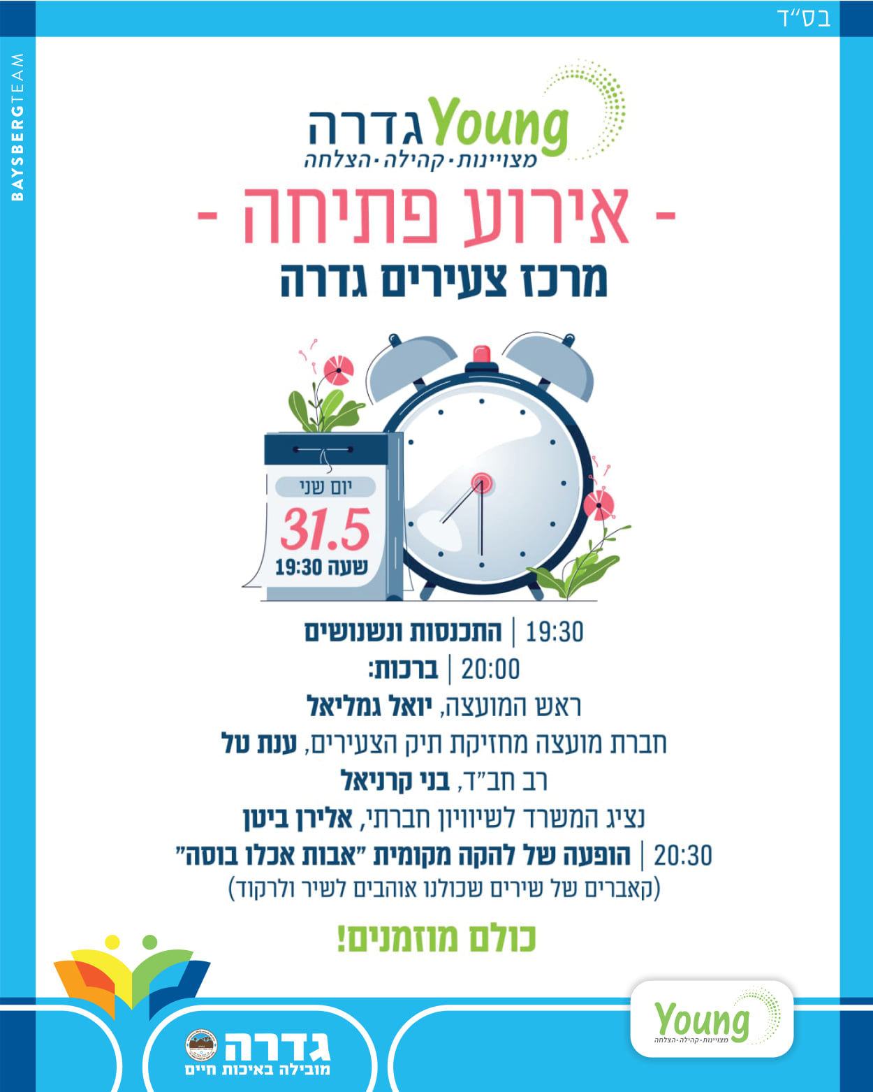 ביום שני 31.5 יתקיים טקס חנוכת מרכז הצעירים של גדרה