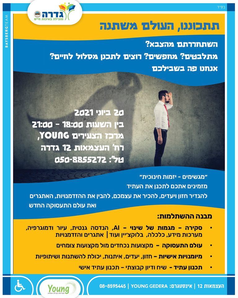 איך מתכוננים לעתיד? ביום ראשון 20.6 מרכז הצעירים בגדרה יקיים מפגש לצעירים בו יקבלו כלים לתכנון העתיד על נושא התעסוקה, מיומנויות אישיות ועוד