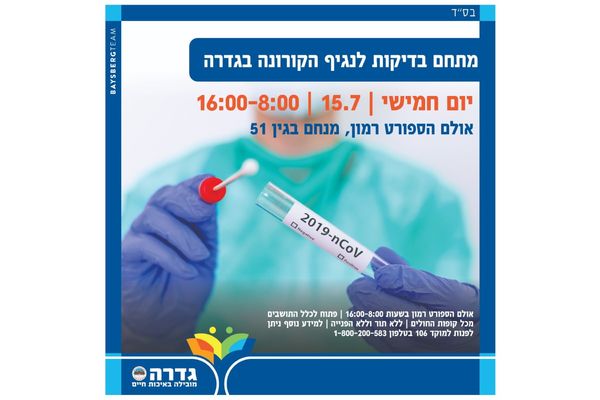 לאור העלייה בתחלואה ביישוב המועצה המקומית גדרה תפתח מחר, חמישי 15.7, מתחם בדיקות באולם רמון, רחוב מנחם בגין 51. המתחם יפתח בין השעות 16:00-8:00 ללא צורך בהפנייה ולכל חברי קופות החולים.