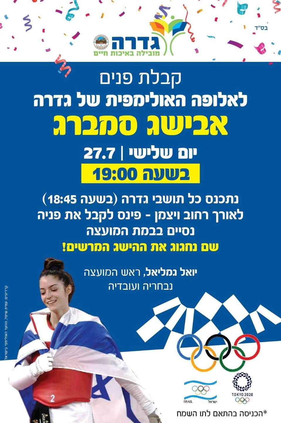 לפני זמן קצר נחתה בישראל, המדליסטית האולימפית של גדרה - אבישג סמבג שזכתה לקבלת פנים חגיגית בנמל התעופה. אל המקום הגיעו בני משפחתה, החבר נמרוד, וחברים שחיכו לה עם בלונים פרחים ושלטים המברכים אותה על הישגה הגדול.