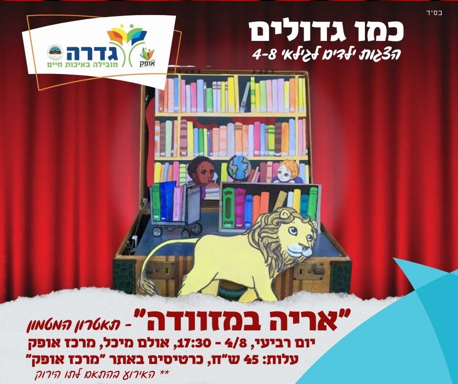 בימים שלישי ורביעי 3-4/8 יוצגו במרכז אופק בגדרה הצגות הילדים "כספיון" ו"אריה במזוודה"