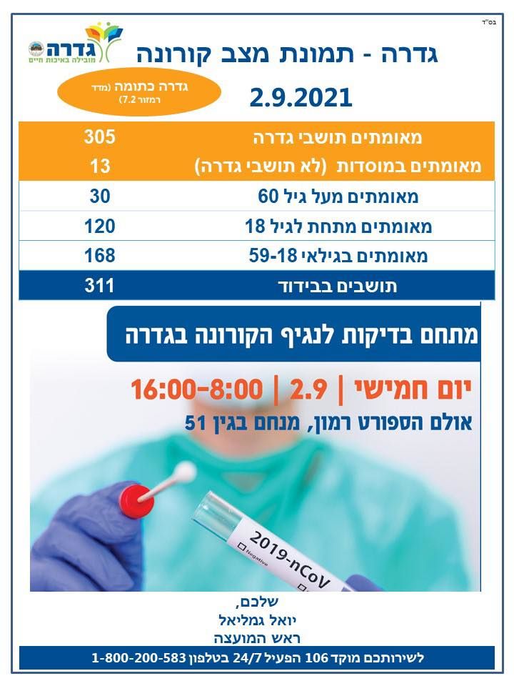 נתוני התחלואה בגדרה ליום חמישי 2.9.21