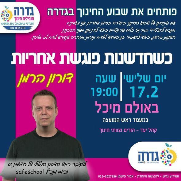 במסגרת שבוע החינוך בגדרה: הרצאה של דורון הרמן להורים וצוותי חינוך בנושא מוגנות ברשת תתקיים ב-17.2