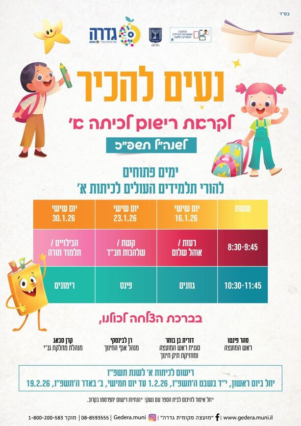 עוד נמסר כי הרישום לכיתה א' לשנת הלימודים תשפ"ז יחל ביום ראשון, ה-1 בפברואר 2026, ויימשך עד ליום חמישי, ה-19 בפברואר 2026.
