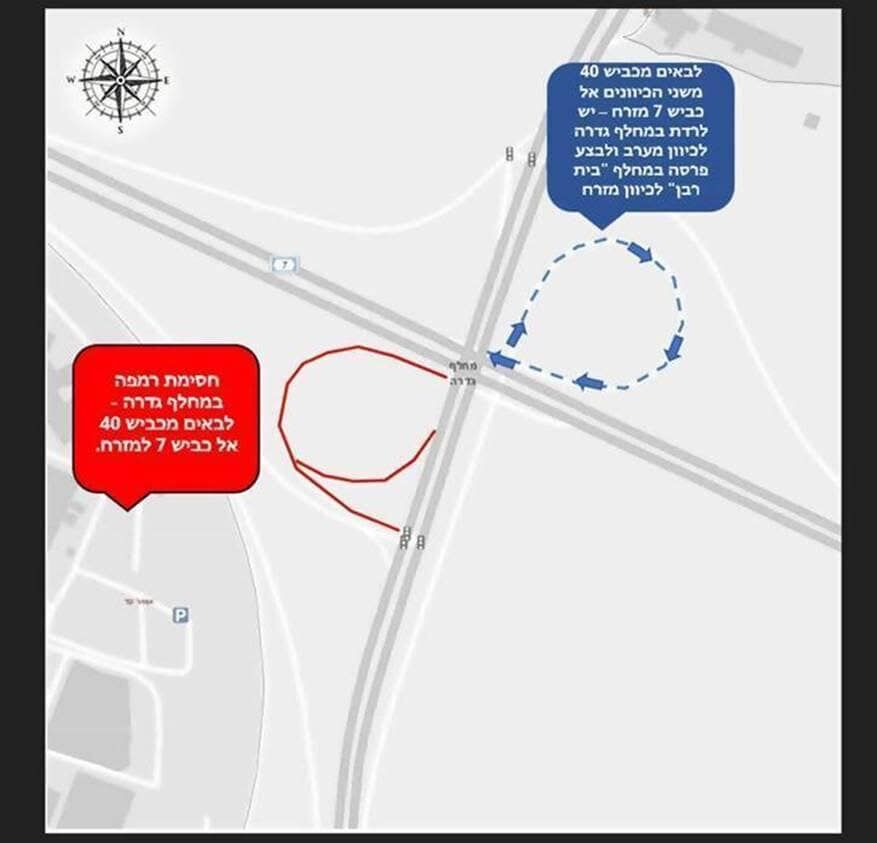לתשומת לב נהגי גדרה! בימים שלישי ורביעי 23-24.11 תיחסם לתנועה רמפת היציאה מכביש 40 אל כביש 7 למזרח בשעות הלילה