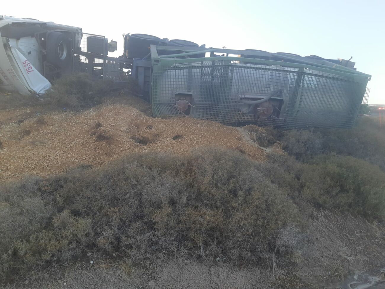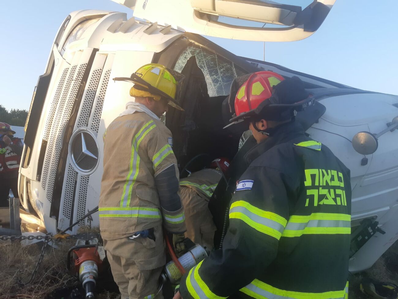 סרטון - משאית התהפכה בכניסה לכביש 7, נהג פצוע קשה