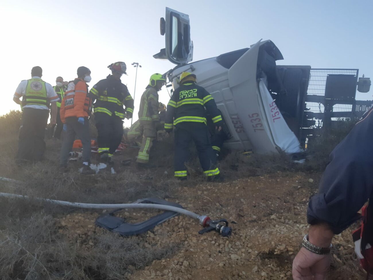 4 צוותי כיבוי וחילוץ בפיקודו של רב רשף עירון הירשפלד, ביחד עם צוותי כיבוי חילוץ ויחידת חומ״ס של מחוז דרום בפיקודו של רב רשף אלקנה ביטון, פועלים במקום, במקביל יש דליפה של חומר מסוכן וכוחות הכיבוי פועלים בשיתוף פעולה לחילוץ ותיחום האירוע.