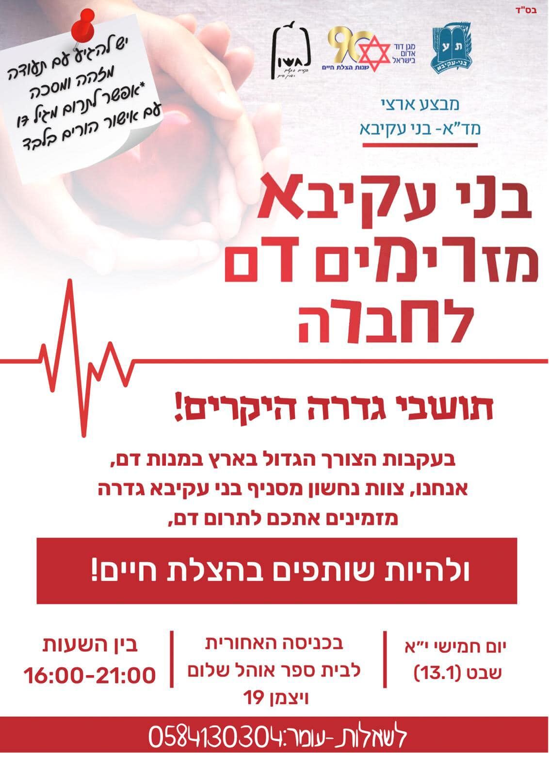 חניכי בני עקיבא בגדרה יקיימו ביום חמישי 13.1 מבצע התרמת דם בבית הספר אוהל שלום