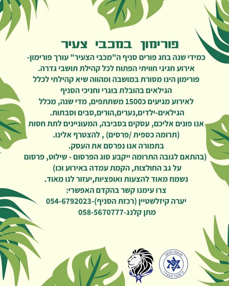 תנועת מכבי צעיר גדרה פונה אל בעלי העסקים ביישוב לסייע להם בתרומות לקיום אירוע הפורימון המסורתי של חג הפורים