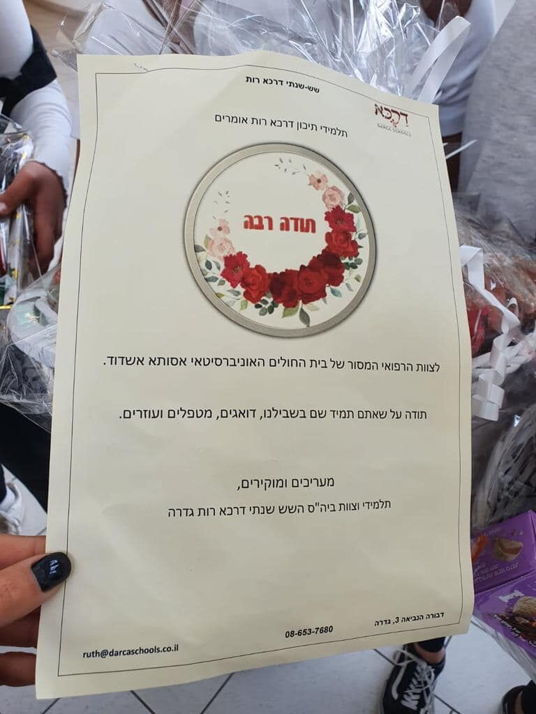 תלמידי דרכא רות בגדרה פנקו את צוותי בית החולים אסותא אשדוד בחבילות מלאות במתוקים וחטיפים כאות תודה על עבודתם החשובה בהצלת חיים