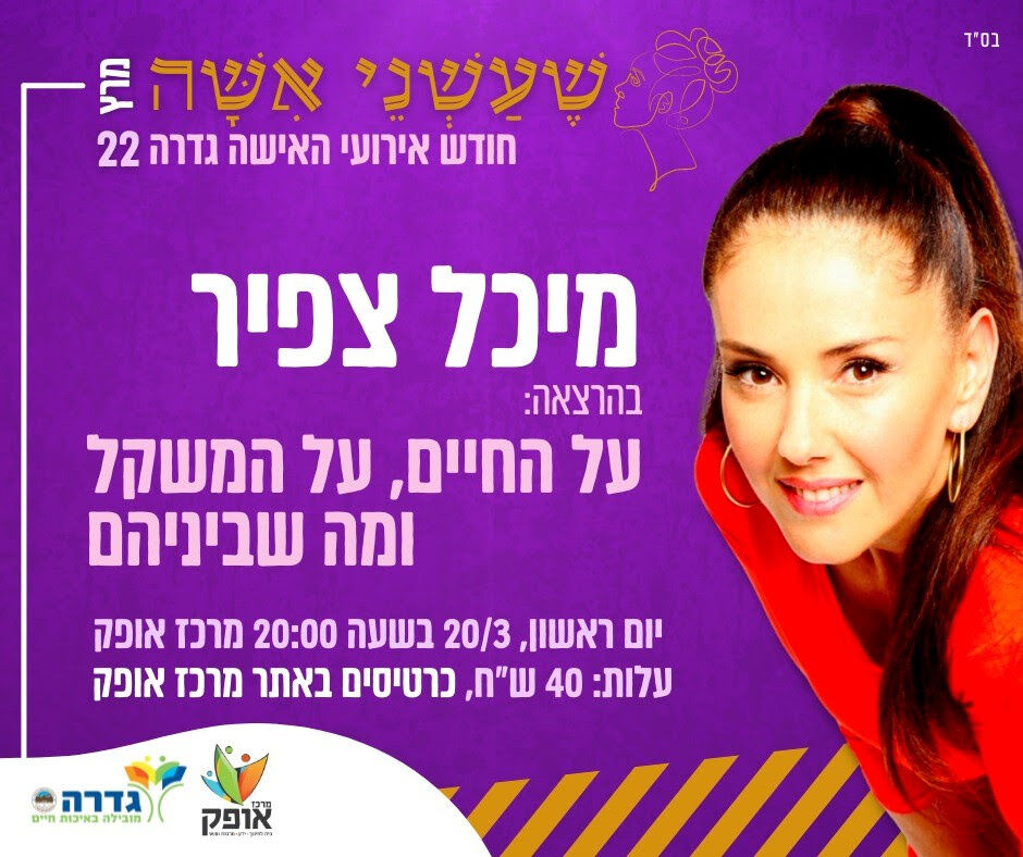 במהלך חודש מרץ יתקיימו אירועי יום האישה בגדרה עם: מיכל צפיר, גלי טוויזר, גילי אפטר אילון ועוד