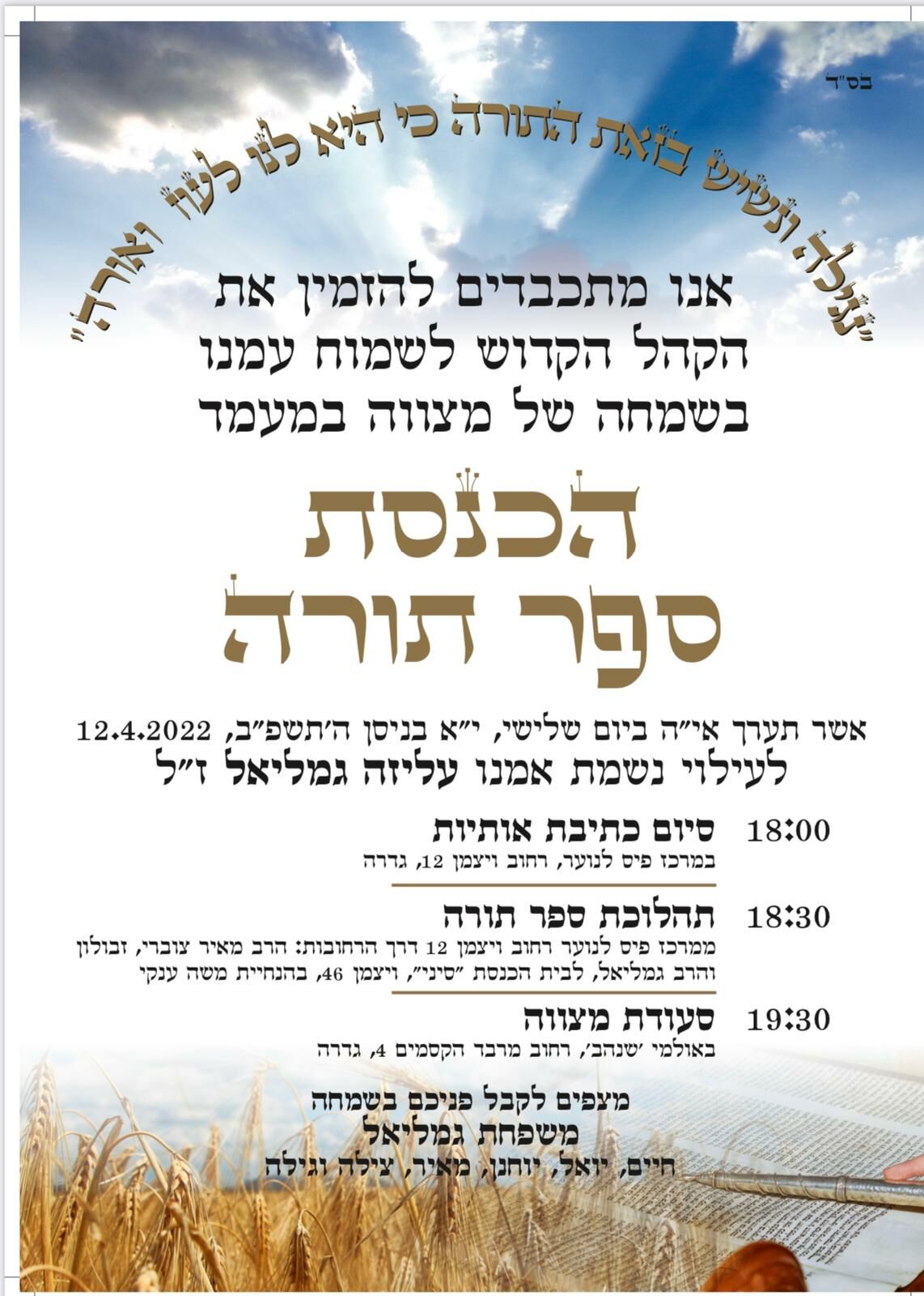 לזכרה של אמא! תושבי גדרה מוזמנים לקחת חלק באירוע הכנסת ספר תורה וסעודת מצווה שיתקיים ביום שלישי 12.4 לזכרה של אמו של ראש המועצה, עליזה גמליאל ז"ל