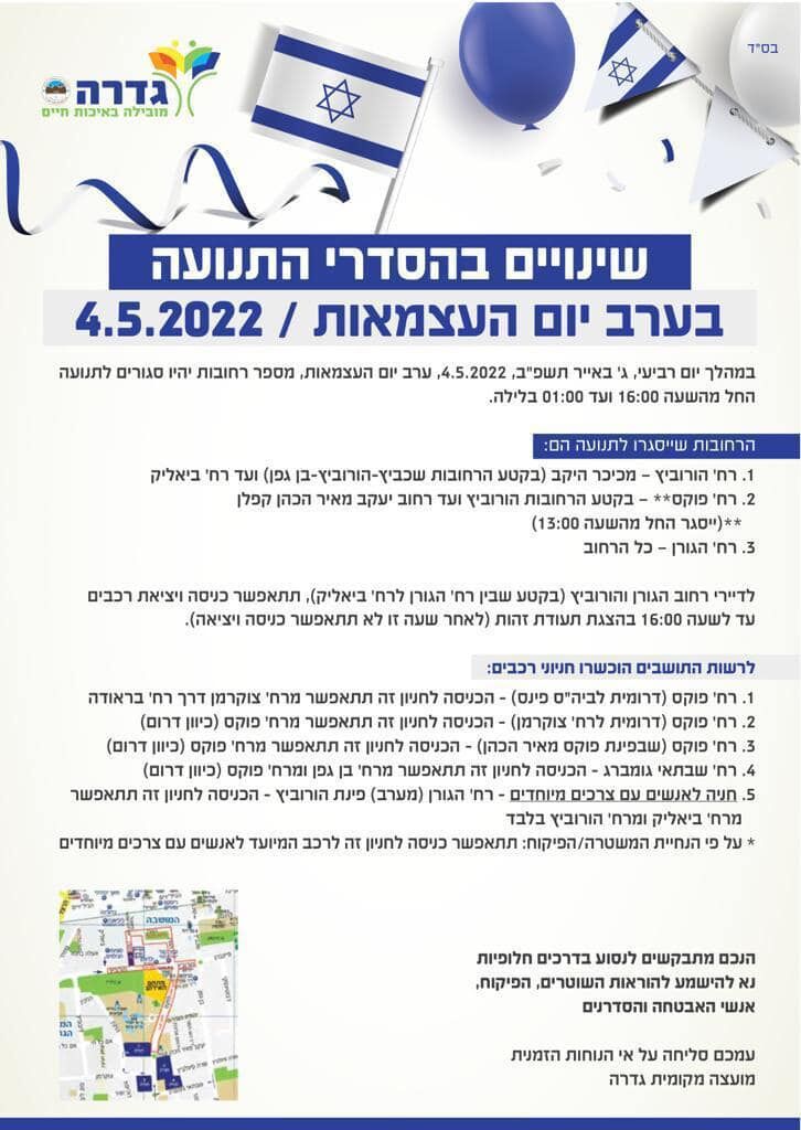 המועצה המקומית גדרה מפרסמת לציבור את הסדרי התנועה שיחולו בערב יום העצמאות 4.5.22.