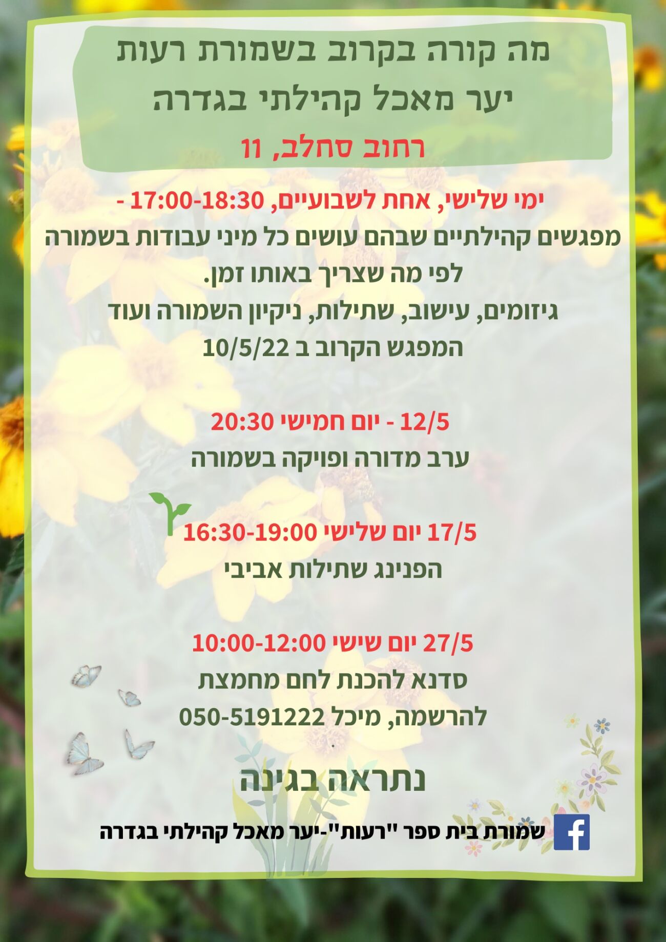 קהילת שמורת יער המאכל רעות בגדרה מזמינה את התושבים לקחת חלק באירועי השמורה שיתקיימו במהלך החודש הקרוב: הפנינג שתילות, סדנה להכנת לחם ועוד