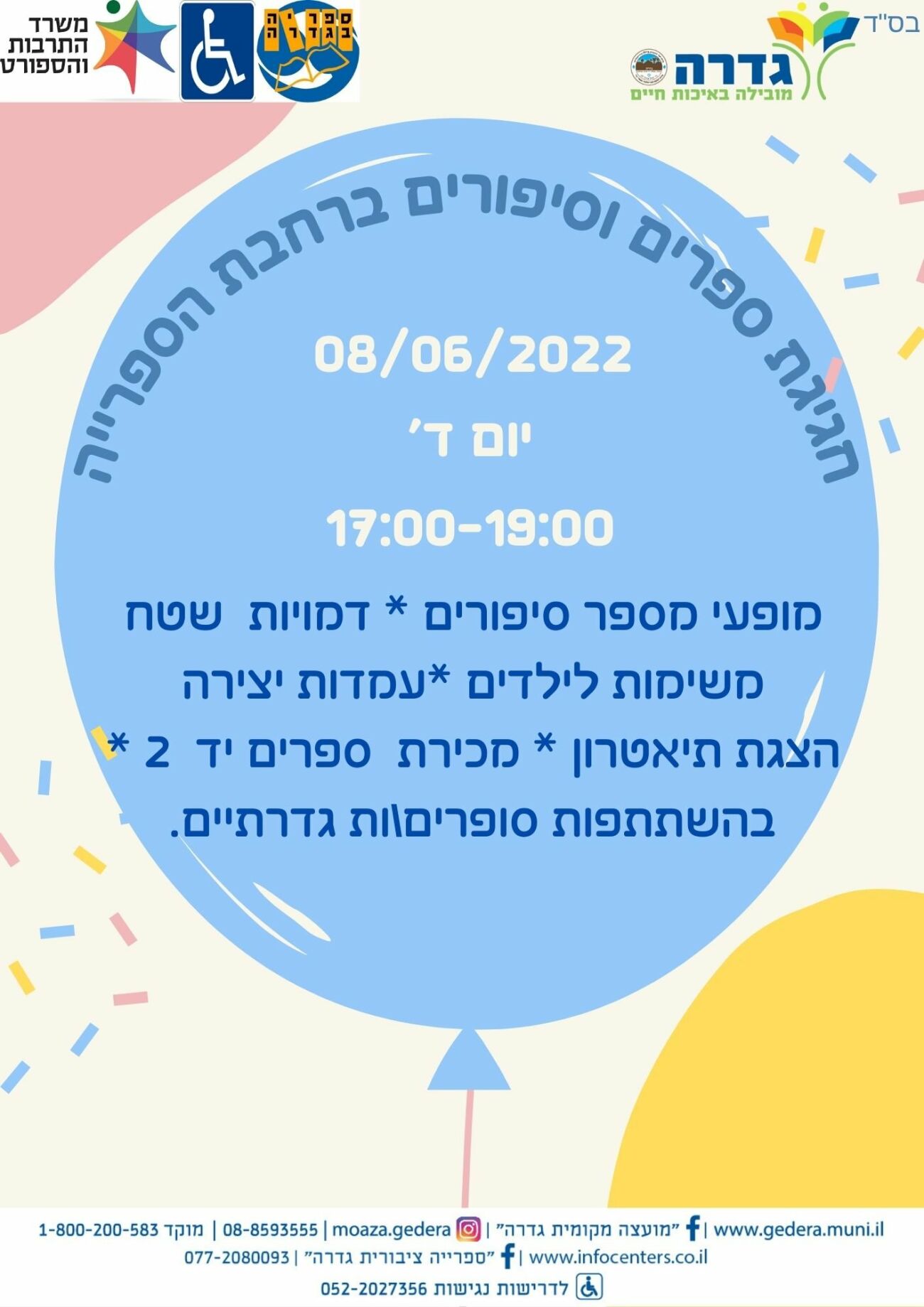 שבוע הספר הפך בשנים האחרונות ל"חודש הקריאה" וזו הזדמנות ליהנות מחודש שלם גדוש בפעילויות לכל הגילאים ולאוהבי הספרים. בספריית גדרה מזמינים את התושבים להפנינג חגיגי שיתקיים ברחבת הספרייה עם מופעי מספרי סיפורים, דמויות שטח, משימות לילדים, עמדות יצירה, הצגת תיאטרון ומכירת ספרים יד 2