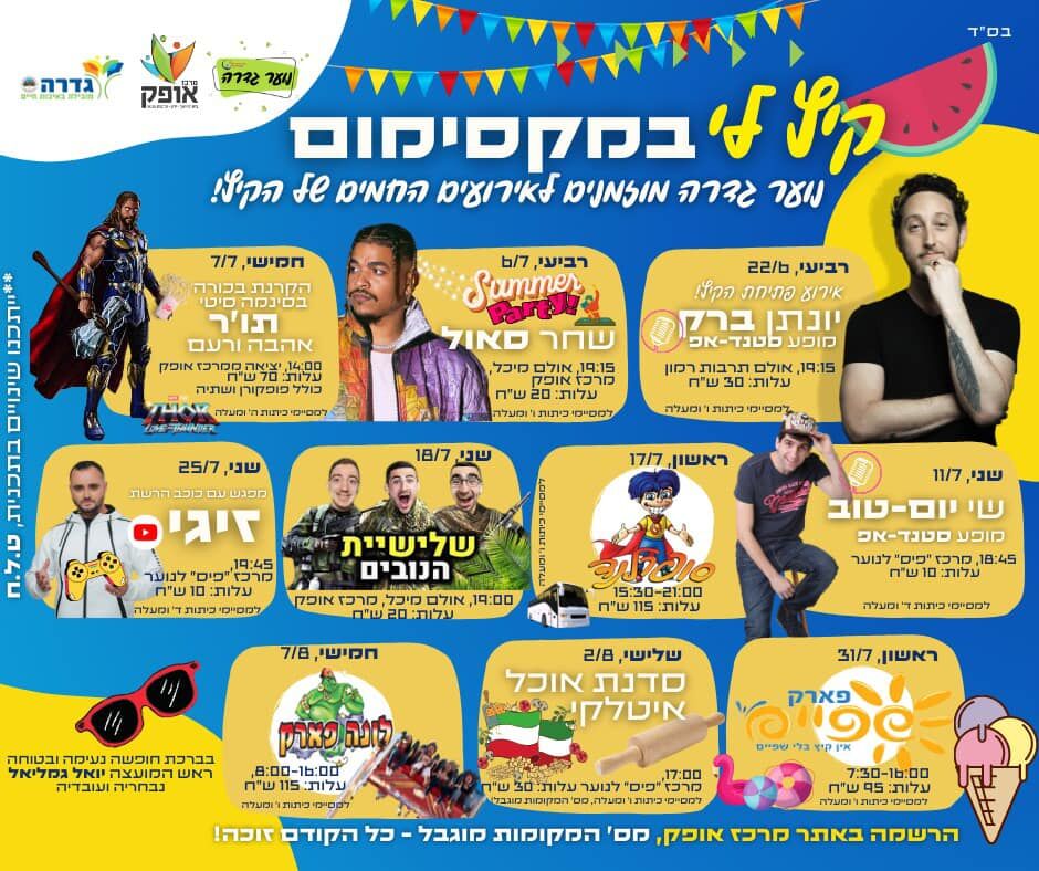 קיץ חם לבני הנוער בגדרה! החל מיום רביעי 22.6 יפתחו אירועי הקיץ לבני הנוער בגדרה עם מופע של יונתן ברק, יציאה לסינמה סיטי, שפיים, מפגש עם זיגי, שלישיית הנובים ועוד