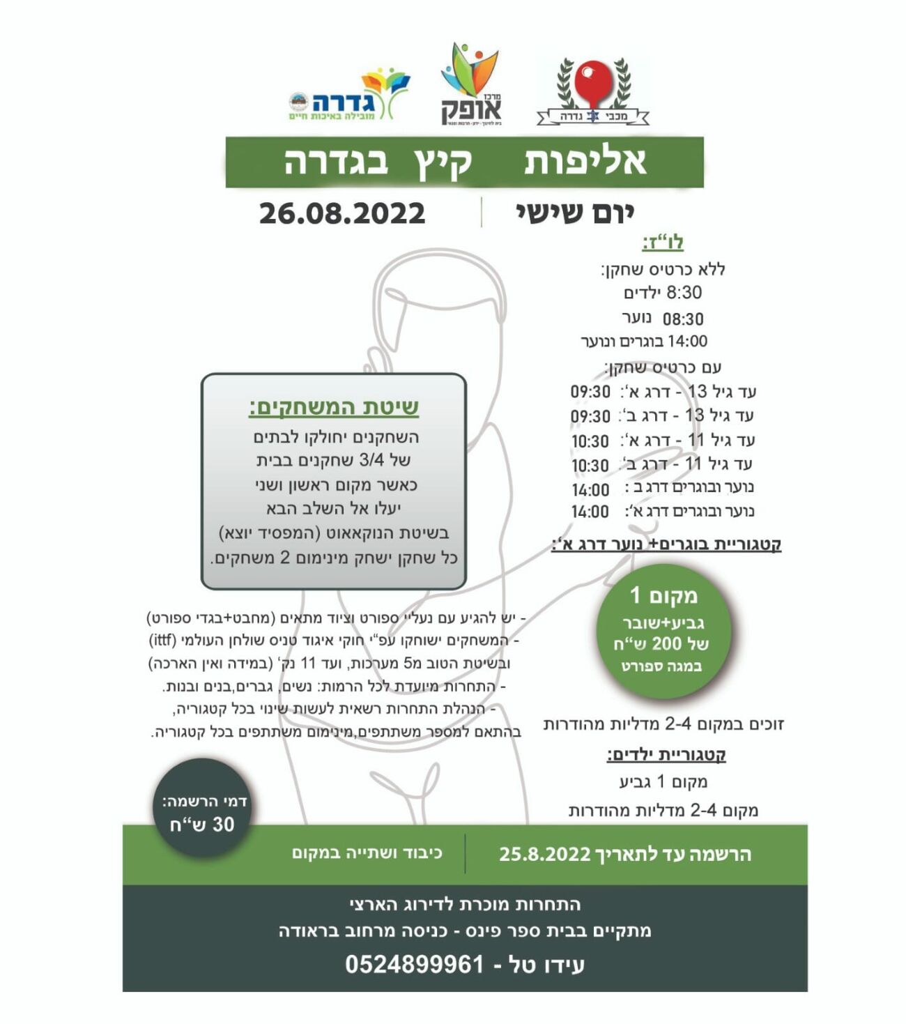 החלה ההרשמה לאליפות גדרה בטניס שולחן שתיפתח ביום שישי 26.8 בבית ספר פינס; ההרשמה פתוחה עד 25.8