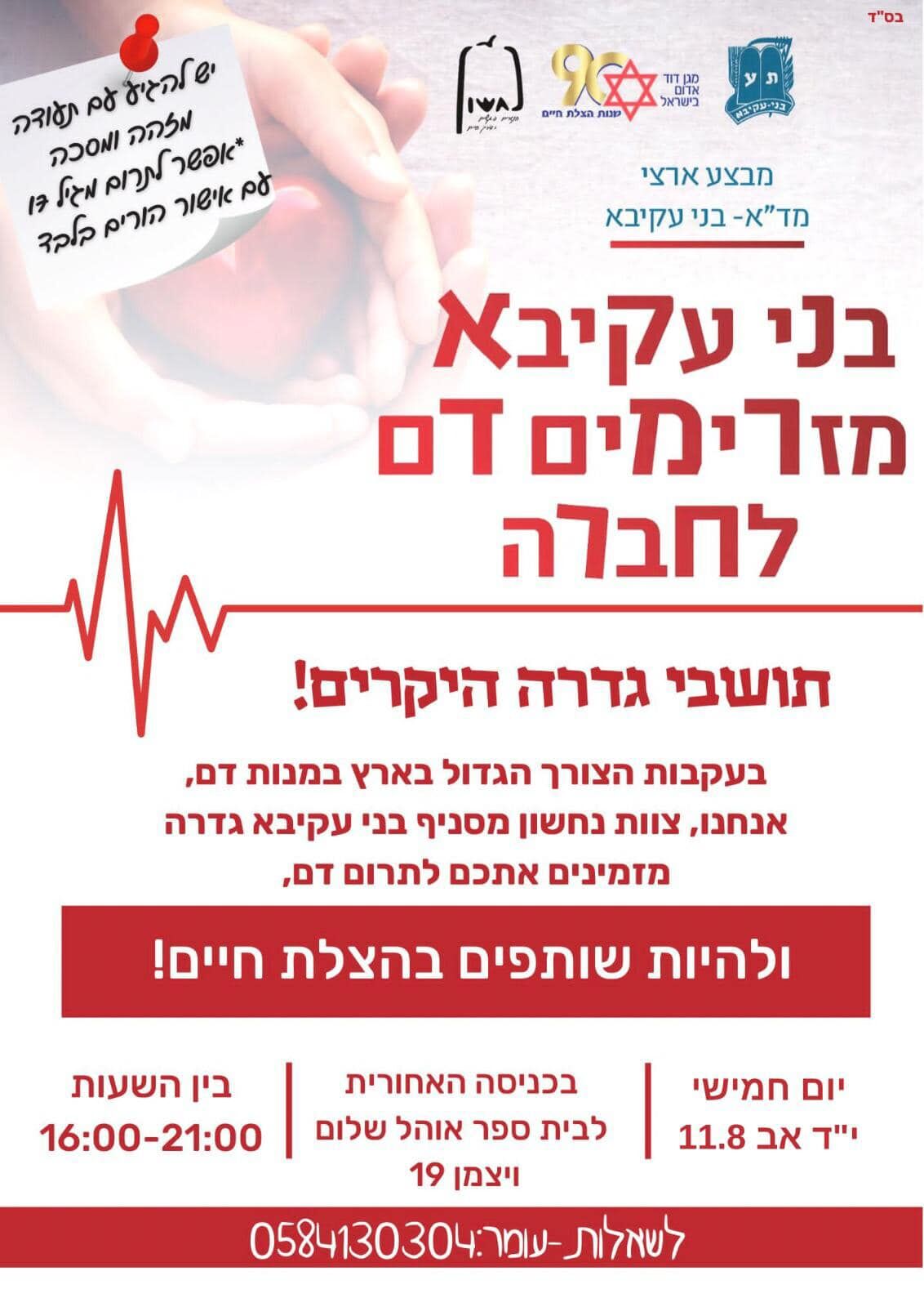 לאור המחסור החמור במנות דם בישראל, תנועת בני עקיבא- צוות נחשון בשיתוף מד"א יקיימו ביום חמישי הקרוב מבצע התרמת דם בגדרה.