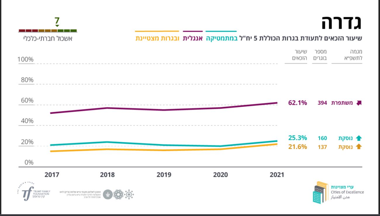 על פי הנתונים של תוכנית "ערי המצויינות" (לשנת 2021- תשפ"א) המתקיימת גם בגדרה, בשנים האחרונות שיעור הזכאים ביישוב עולה בשלושת הפרמטרים: