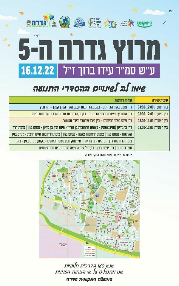 כחלק ממרוץ גדרה ה-5 ע"ש סמ"ר עידו ברוך שיערך ביום שישי 16.12 יחולו שינויים בהסדרי התנועה ברחבי גדרה: