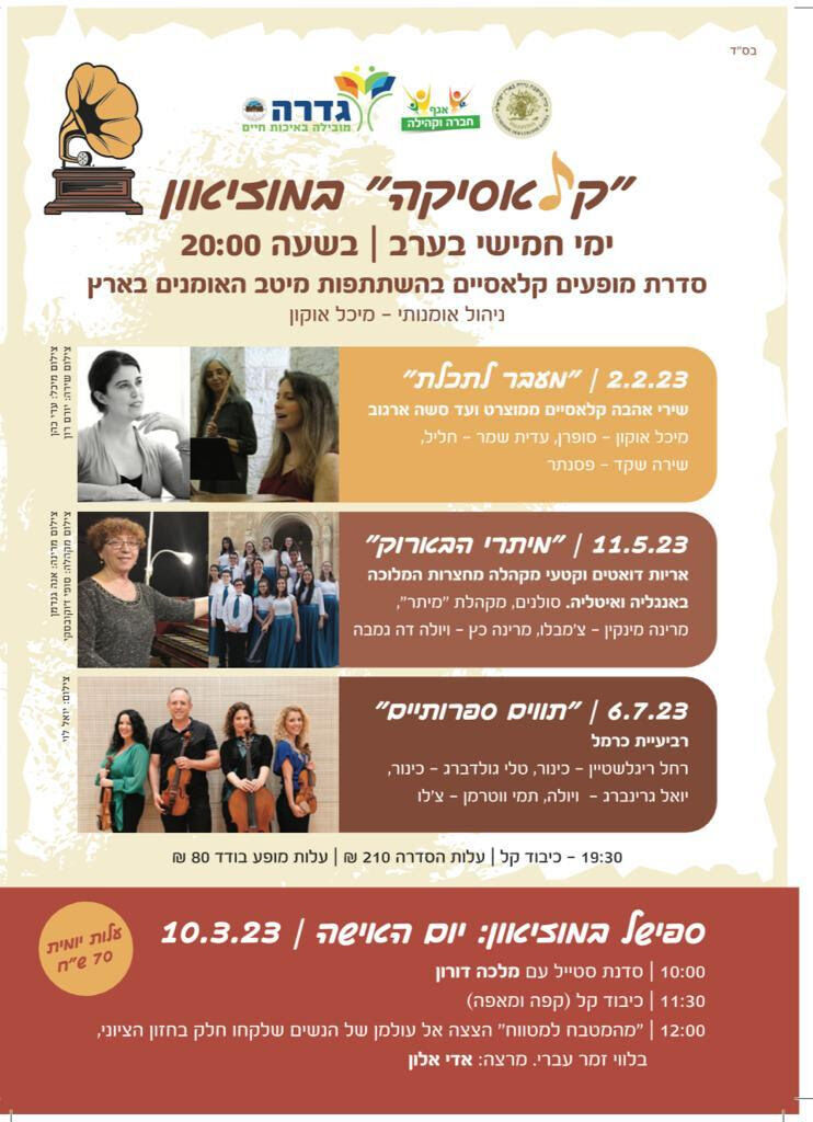 החל מיום שישי (30.12) יפתחו במוזיאון גדרה אירועי "שישי תרבות" ו"קלאסיקה במוזיאון"- מופעי תרבות ומוזיקה קלאסית, שירי אהבה, מוזיקת פולקלור ועוד