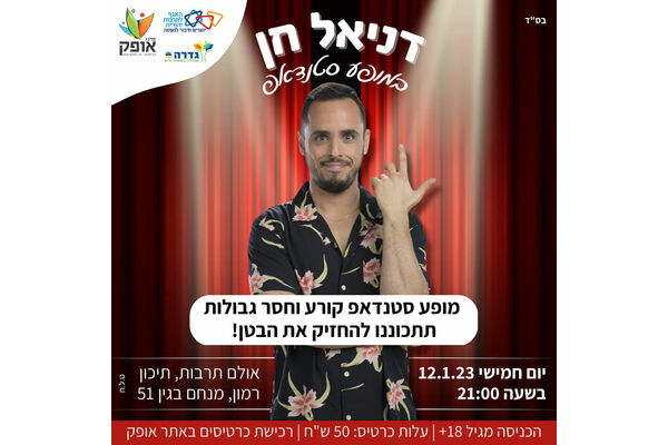 ביום חמישי 12.1 יתקיים באולם תרבות רמון גדרה מופע הסטנדאפ של דניאל חן