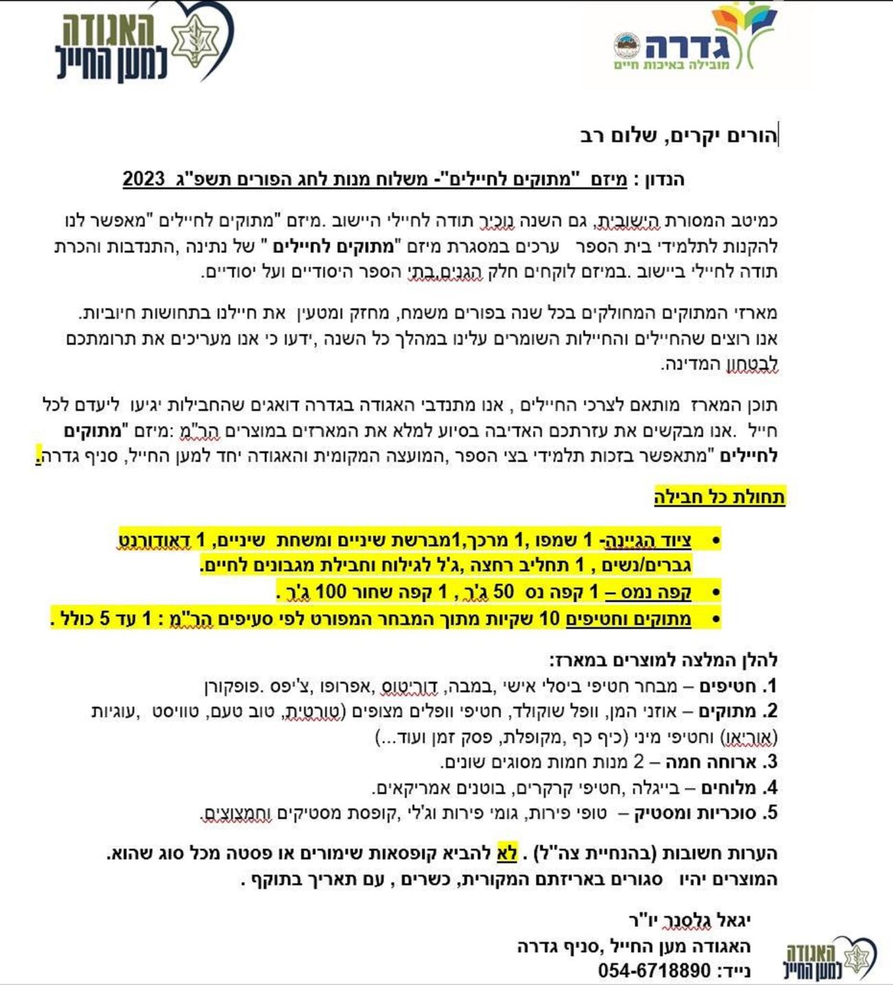 ניתן לתרום מוצרי הגיינה, מתוקים וחטיפים- הפירו המלא מצ"ב בכתבה