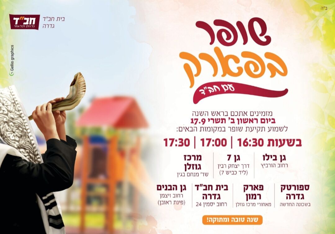 גם השנה יקיים בית חב"ד בגדרה תקיעות שופר של ראש השנה ב7 מוקדים ברחבי היישוב (יום ראשון 17.9)