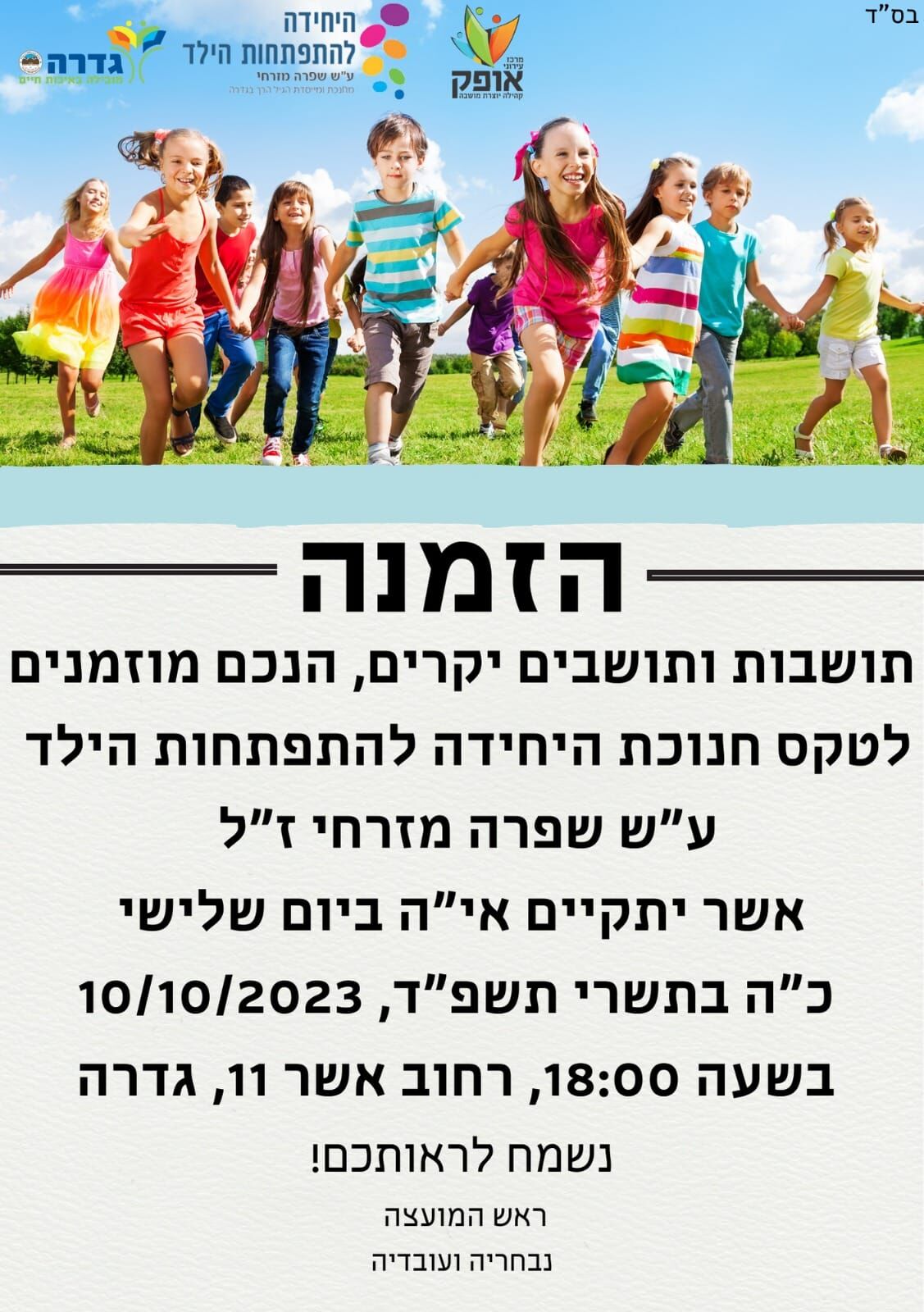 מועצת גדרה מזמינה את התושבים לאירוע חנוכת היחידה להתפתחות הילד ע"ש שפרה מזרחי ז"ל.