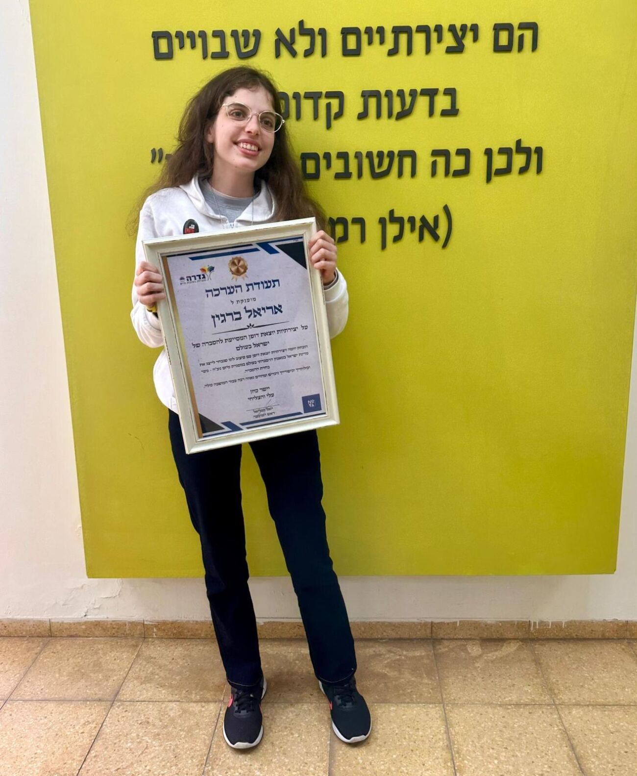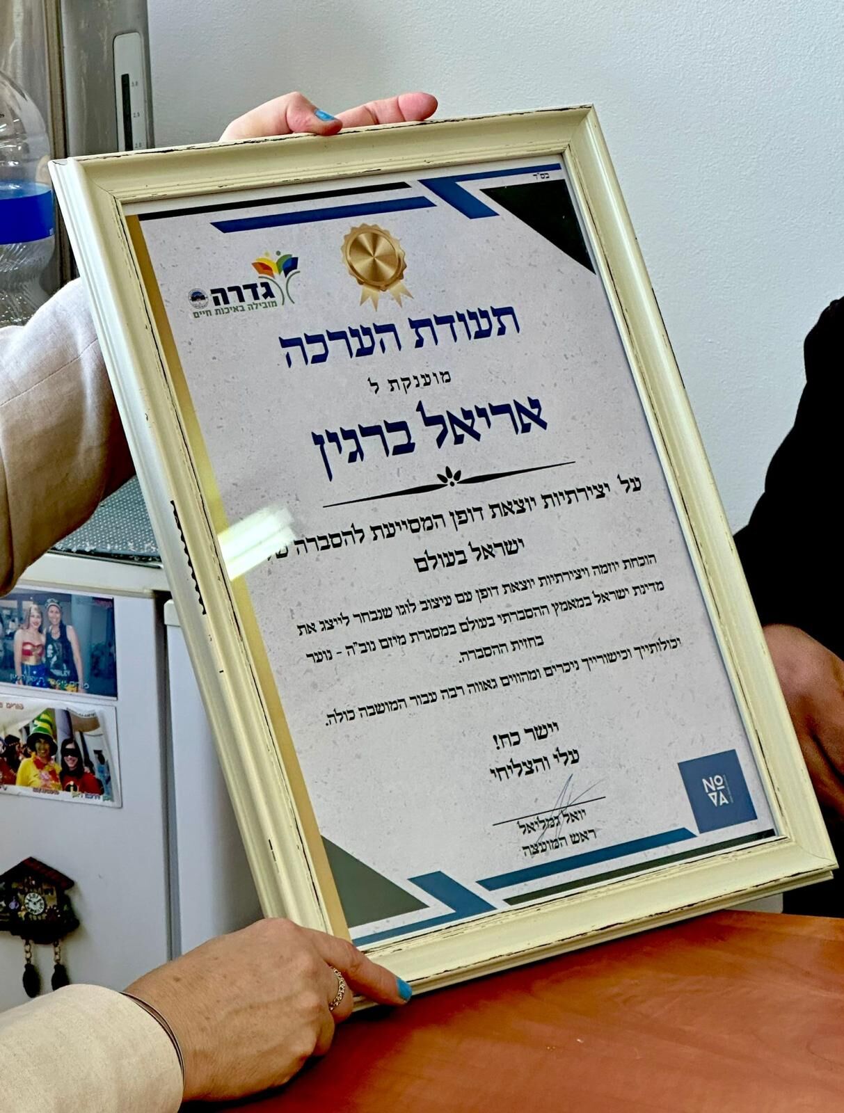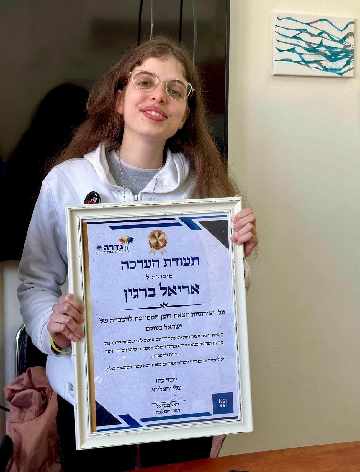 הבוקר ראש המועצה הגיע להעניק לאריאל ברגין, תושבת גדרה ותלמידת כיתה י"א בדרכא רמון, תעודת הערכה על יצירתיות יוצאת דופן המסייעת להסברה של ישראל בעולם. אריאל עיצבה לוגו במסגרת מיזם ההסברה הארצי של בני הנוער בחו"ל, מיזם "נוב"ה - נוער בחזית ההסברה". הלוגו שעיצבה נבחר במקום הראשון וייצג את ישראל בהסברת הנוער בחו"ל.