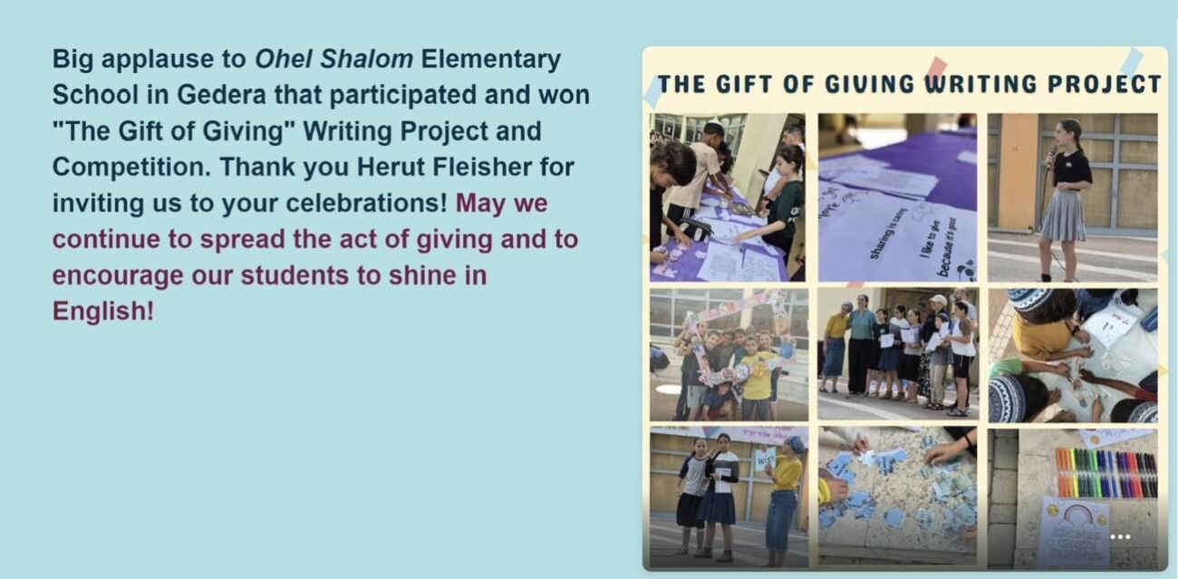 בית הספר אוהל שלום בגדרה והתלמידות קרן סנדרס ונווה ונגרובר זכו בתחרות הכתיבה המחוזית והארצית באנגלית The Gift of Giving