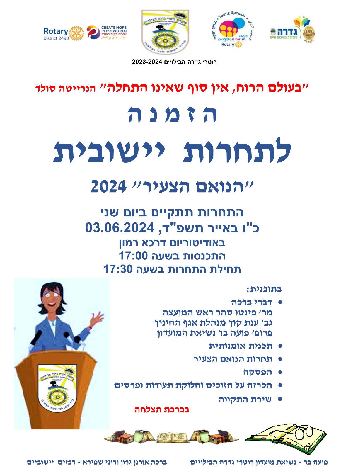 ביום שני 3.6 תתקיים באודיטוריום דרכא רמון תחרות הנואם הצעיר היישובית של גדרה